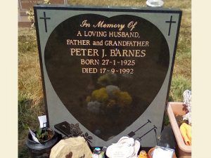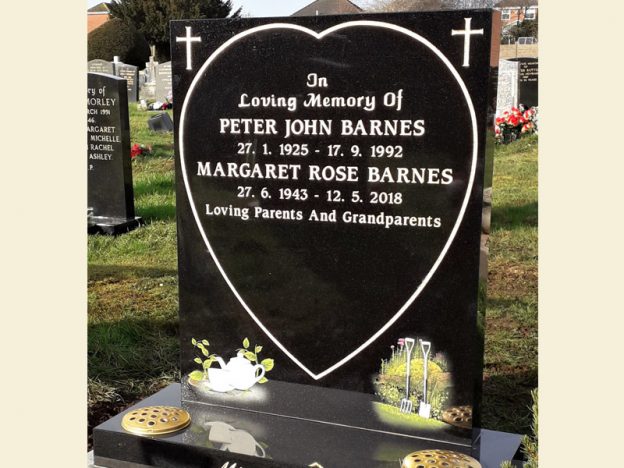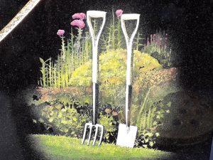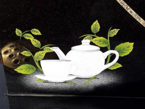 Full restoration of black granite memorial to include skimming of old inscription and designs with new inscription in gold leaf and beautiful hand painted designs in colour.