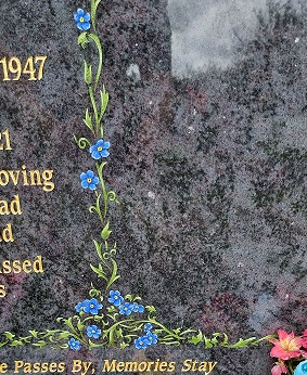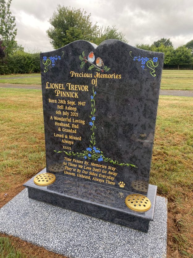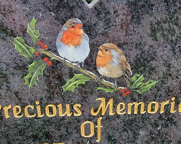 Work Carried out: All Polished Lavender Blue Granite Memorial with wonderful hand painted Robin and floral designs