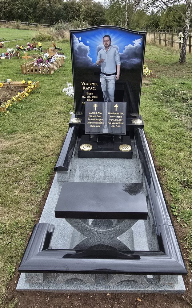 Work carried out: A beautiful and stunning Headstone, Book & pedestal kerbs in Black Granite with a hand cut and painted portrait, finished of with a Black Granite Bench to sit and pay your respects.