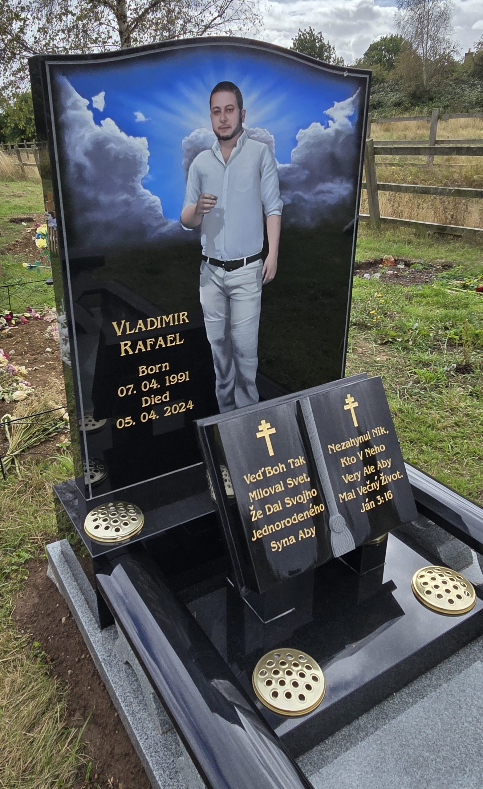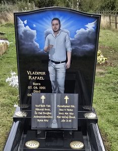 Work carried out: A beautiful and stunning Headstone, Book & pedestal kerbs in Black Granite with a hand cut and painted portrait, finished of with a Black Granite Bench to sit and pay your respects.