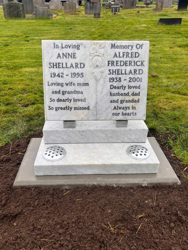 Work carried out: Existing marble book professionally machine cleaned and all lettering recut and releaded to look its very best, old kerbset removed and a new layer of top soil placed on the grave for grass seeding.