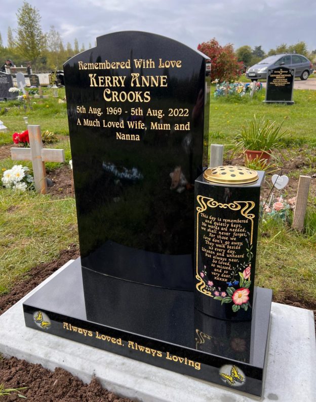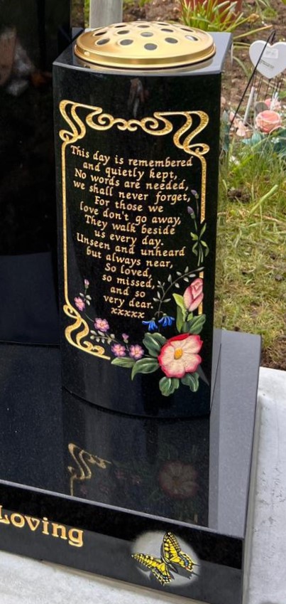 Work Carried Out: A beautiful shaped black granite memorial and shaped side vase, a lovely delicate hand painted flower and border design along with two beautiful butterflies on the front of the base.